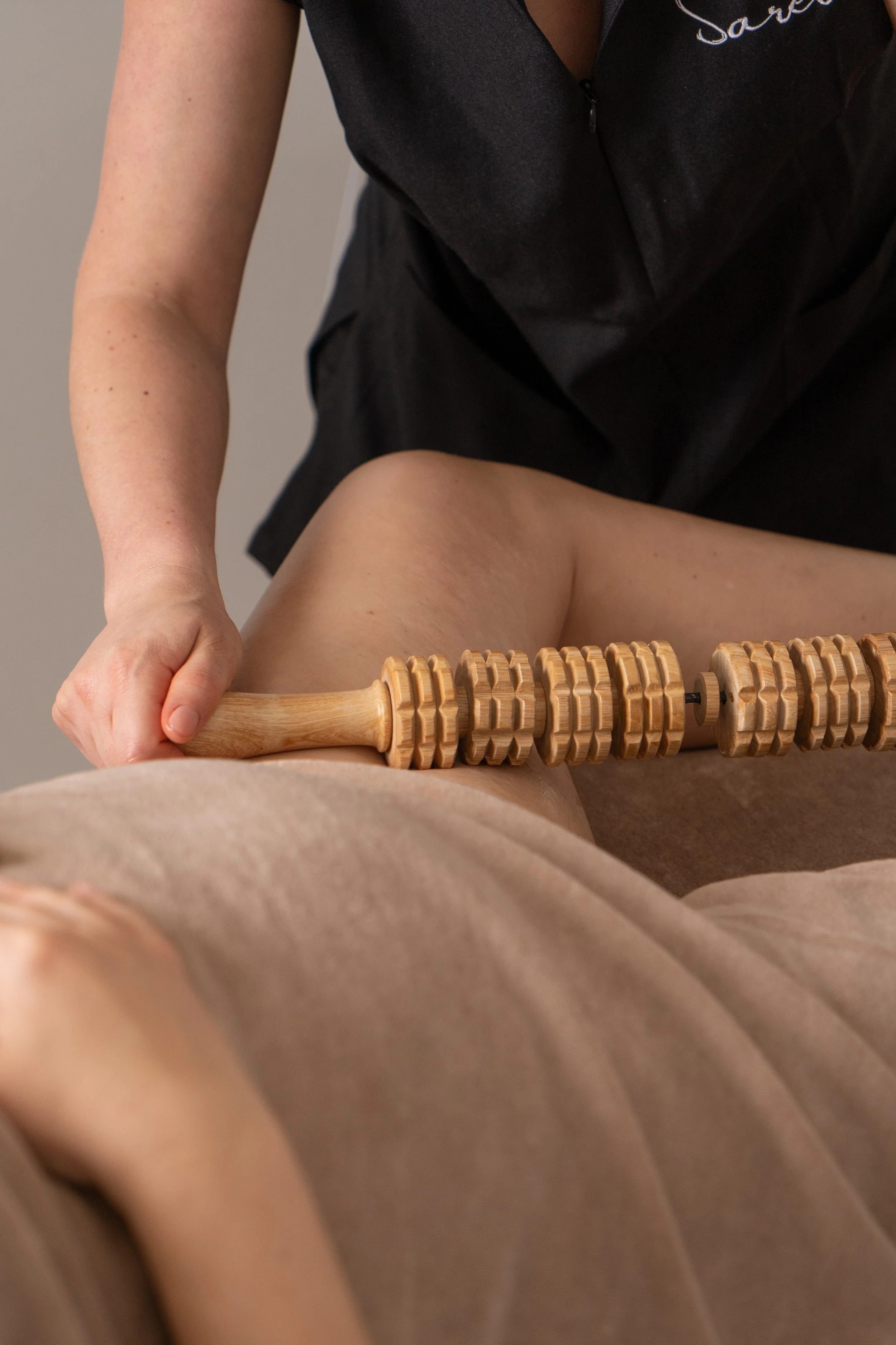 ATTENTION : La madérothérapie peut potentiellement entrainer l'apparition de bleus qui disparaitront au bout de quelques jours. Cette technique vise principalement à casser les graisses. Les cellules adipeuses sont traversées par des vaisseaux sanguins et la compression avec les outils en bois peuvent provoquer des hématomes qui disparaitront spontanément. Cette réaction est complètement temporaire et non invasive.